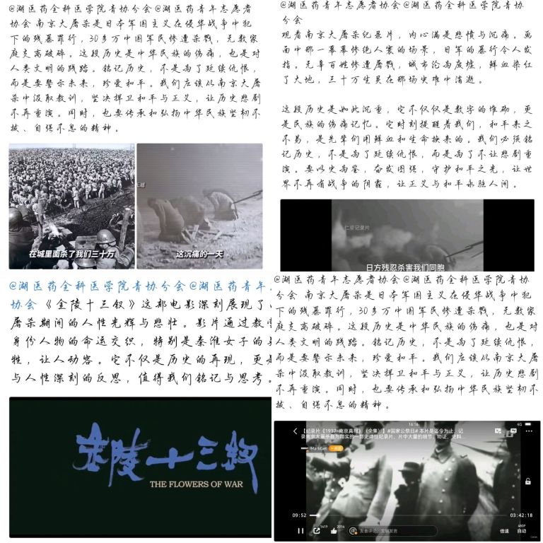 活动中,同学们深入探究南京大屠杀的历史,积极分享感悟,深刻体会战争的残酷与罪恶。他们铭记历史教训,进而激发起强烈的民族自尊心与爱国热情。随后,大家观看相关影视纪录片,这一过程不仅加深了同学们对历史细节的了解,而且唤醒了大家守护和平,铭记历史并传承志向的使命感。通过对历史的回顾,湖医药青年时刻提醒自己不能忘却往昔,要奋勇前行。截止12月13日晚18点,该活动共有2300余人参加。